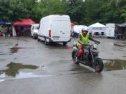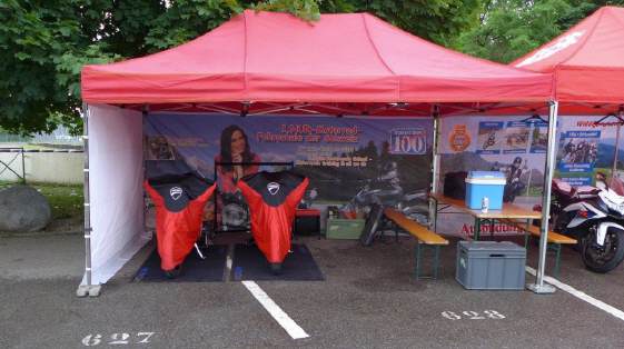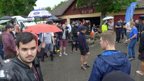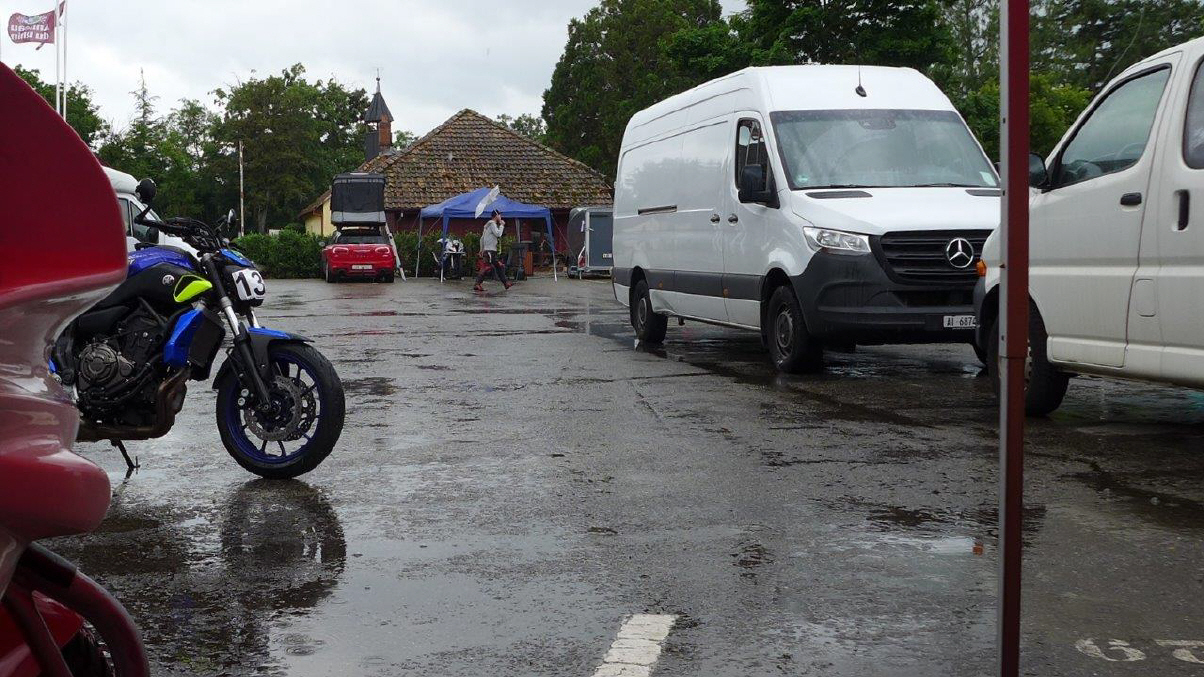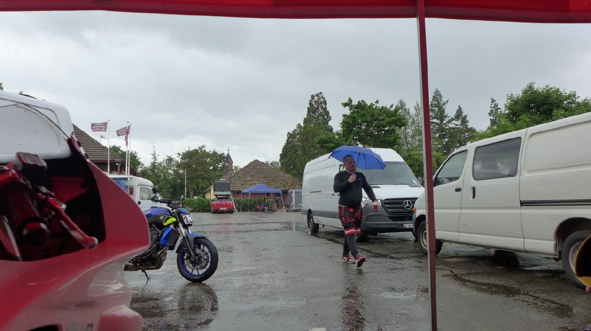 Der erste Morgen war ziemlich frustierend: Hätten wir Jasskarten dabei gehabt, so hätten wir spielen können. Immer wenn es aussah, dass es bald losgehen könnte, kam die nächste Front. Nach drei Turns, in welchen ich gerade Mal einen fahren konnte, war bereits Mittagspause. Es gibt einen Betreiber eines Essenskiosks, bei dem ab 10 Uhr beispielsweise Pizza, aber auch Burger und Salate bestellt und dann gestaffelt in der Zeit am Mittag abgeholt werden können. Dank unserer Zelte konnten wir einigermassen am Trockenen speisen. |