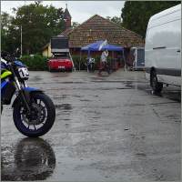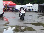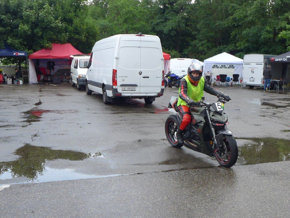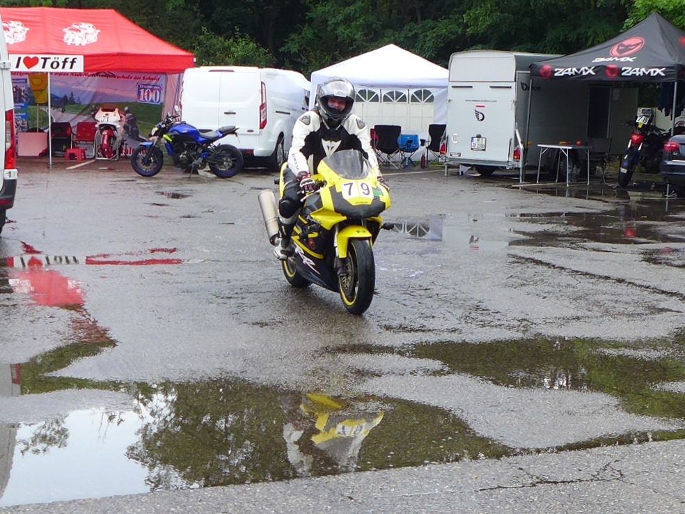 Kurz vor der Mittagspause hörte der Regen auf und so machten sich unsere «StrassenfahrerInnen» auf den Weg. Alle, die profilierte Strassenreifen hatten, konnten sich auf die Strecke wagen. Neben der Nässe machten auch die Windböen zu schaffen. So zogen sie gemächlich ihre Runden, schliesslich waren alle wegen dem Fahren hierher gekommen. Für die Slickfahrer repetierte sich der Vortag: Herumsitzen! Einige dieser Fahrer brachen auf, machten sich auf den Heimweg - schade, denn der Nachmittag wurde später richtig gut ... |