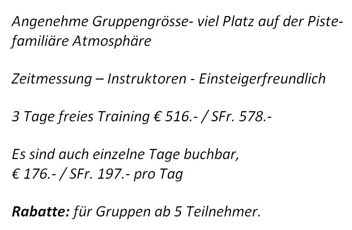 Da sich bis jetzt erst sehr wenige Leute angemeldet haben, hat Hansruedi den Preis reduziert, um noch mehr Leute dazu zu motivieren, einmal den Versuch auf der Rennstrecke zu machen: Es hat VIEL, VIEL Platz - auch für Neulinge!
