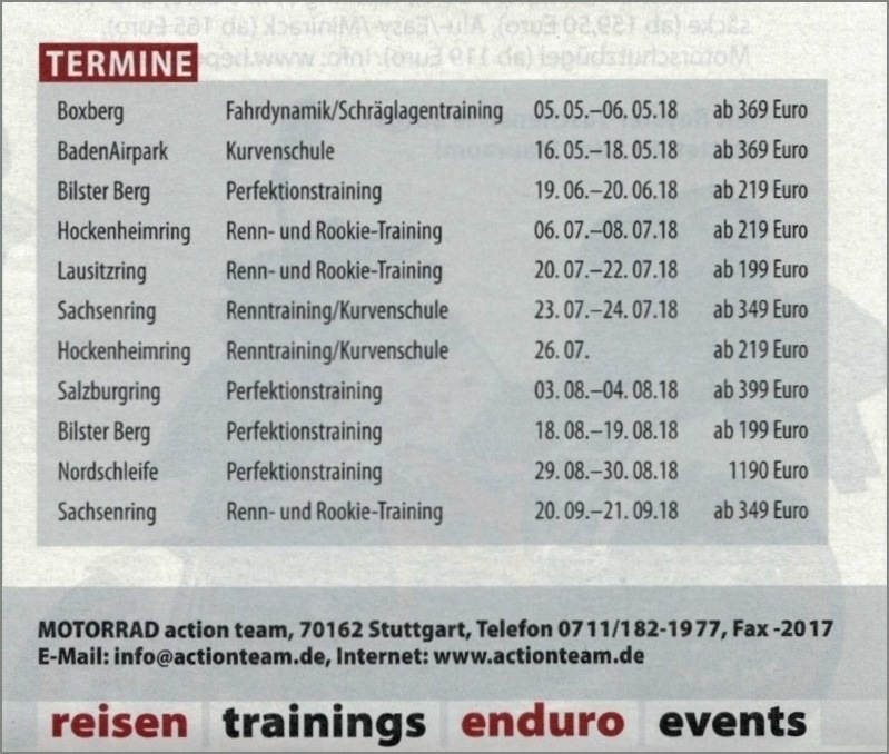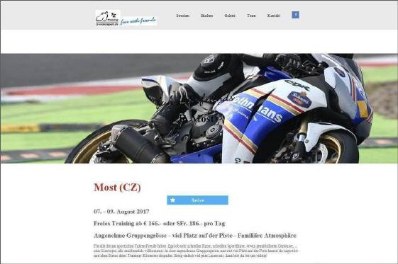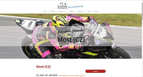 Unter Veranstaltungen gibt's AKTUELL DAS RENNSTRECKENTRAINING IN MOST/CZ: Kurzfristig noch Möglichkeit, mit einzusteigen! Wer allenfalls nur zum Zuschauen und Mitfiebern mitkommen möchte, ist herzlich eingeladen! Denn alleine die Strecke zu fahren ist unangenehm. (mit Motorrad und Teilnahme am Rennstreckentraining: Beteiligung an Benzinkosten, ohne Töff nur Hotelkosten ca. Fr. 200.-) Im Bus habe ich Platz für 1-2 Mitfahrende.