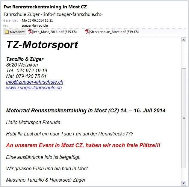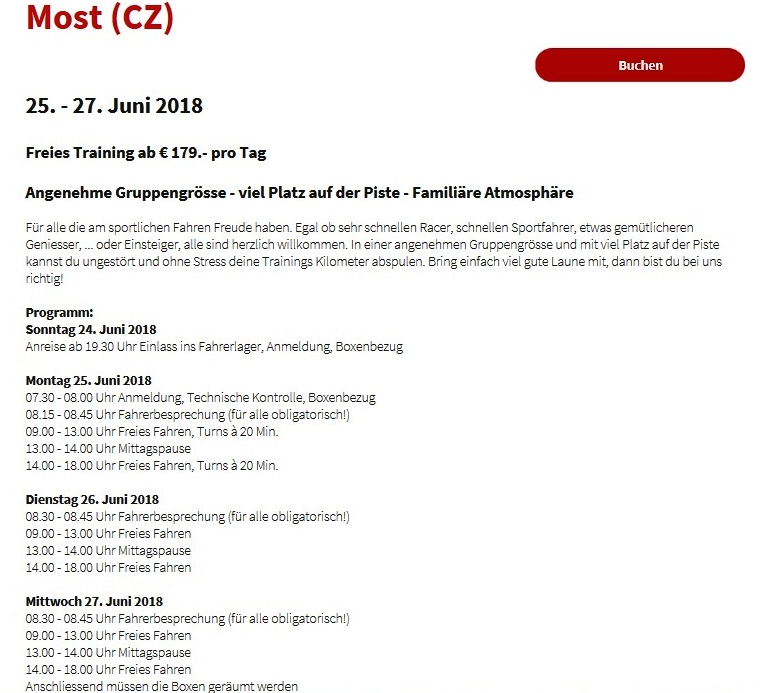 Für das 3-tägige Rennstreckentraining in Most/CZ besteht bereits eine Warteliste! Ducati-Claudio und ich sind fix angemeldet, ev. kommt Yannis dazu. Wie immer fahren wir am Sonntag hin und am Donnerstag wieder zurück. Informationen direkt beim Veranstalter: www.tz-motorsport.ch