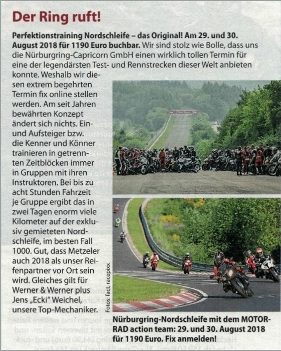 Das Perfektionstraining auf der Nürburgring-Nordschleife ist die Krönung der Weiterbildung in der Karriere eines Töff-Fahrers. Wir waren 2010 zusammen mit dem Schweiz. Töff-Fahrlehrer-Verband dort, ein grosser Bericht findest Du hier Ein weiteres Mal waren wir im darauffolgenden Jahr 2011. Nun wäre es wieder einmal Zeit, eine Gruppe zusammenzukriegen: Der Erfolg ist garantiert! Es ist eine teure Veranstaltung, aber «sie ist ihren Preis wert»!