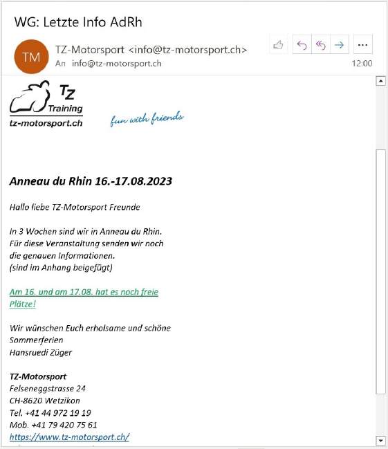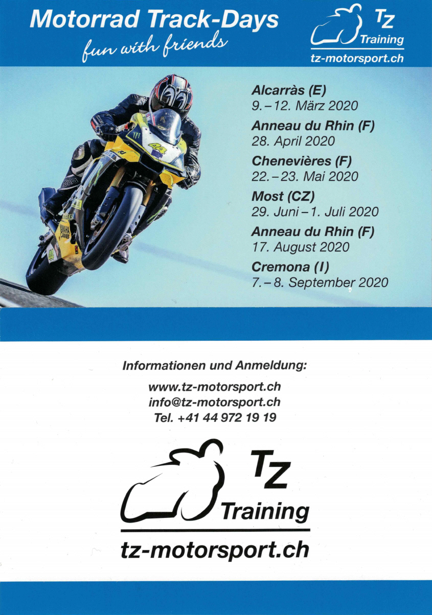 Wer zu den Rennstreckentrainings von tz-motorsport.ch geht, muss sich direkt beim Veranstalter anmelden. Bei eintägigen Veranstaltungen (13.7 Anneau du Rhin) kann man am selben Tag hin- und zurückfahren.
