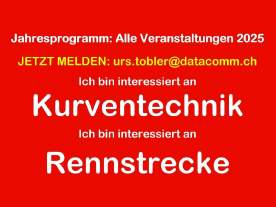 Am 7.Febr. geht das Mail raus: Ich muss (falls es genügend Interessenten, mind. 6) für den KT2-Kurs das Str.V.amt in Zug reservieren, ebenfalls muss ich zu den anderen Veranstaltungen wie WB-Kurs Interlaken, versch. Rennstrecken-Trainings Eure Wünsche haben, um den definitiven Kalender festzulegen! Mail an urs.tobler (at) datacomm.ch