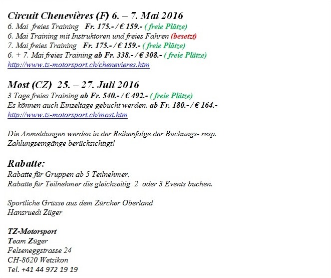 Bei diesen Rennstrecken-Trainings von tz-motorsport.ch bin ich angemeldet und sie wurden bestätigt. Als Pensionär bin ich auch kurzfristig für eintägige Rennstrecken-Veranstaltungen mit meiner Logistik verfügbar, dabei kann ich technische und fahrerische Unterstützung bieten. Wer entsprechende Angebote zu besuchen plant, darf mich nach meiner Verfügbarkeit anfragen. Beteiligung an den Benzinkosten ist Ehrensache.