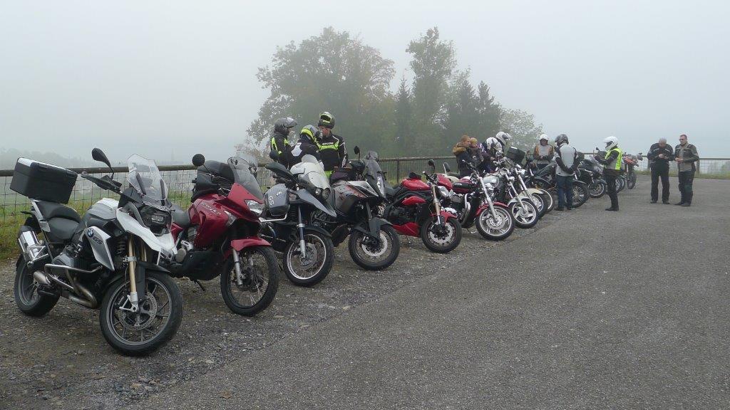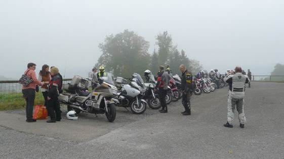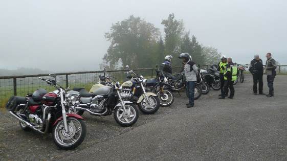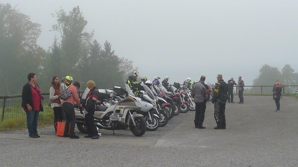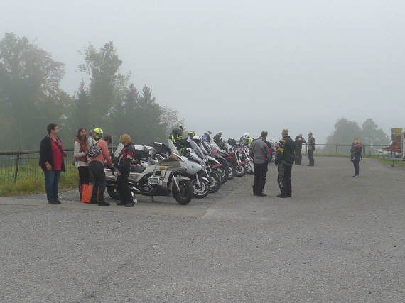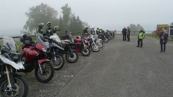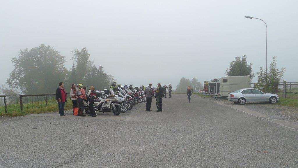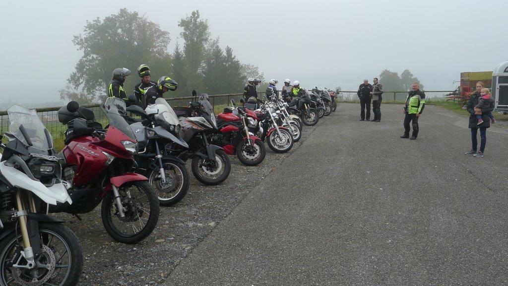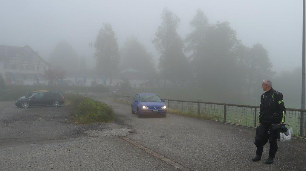 Von der Fähre dem See entlang bis nach Stäfa dominierte weiterhin das Grau, aber über dem See machten sich erste Löcher bemerkbar, wo die Sonne drückte. Meine Hoffnung stieg, dass es bis zu unserem Start um 11 Uhr schönes Wetter sein dürfte. Als ich in der Wanne eintraf, war ich natürlich nicht der erste – aber immer noch rechtzeitig, um ein planloses Parkieren der Maschinen zu verhindern. So stellten dann alle den Töff auf den vorgesehenen Parkplatz unterhalb der Strasse. So konnten wir dann gut die Gruppen bei der Abfahrt bilden und mussten nur nach rechts einbiegen. Aber dies wussten ja nur die Tourguides, denn niemand ausser ihnen konnte ahnen, wo uns diese «Fahrt ins Blaue» mit unbekannten Ziel hinführen würde.
