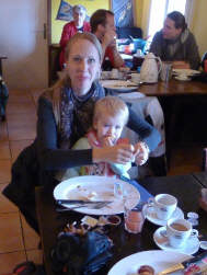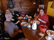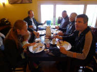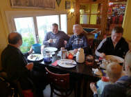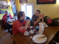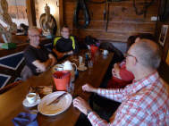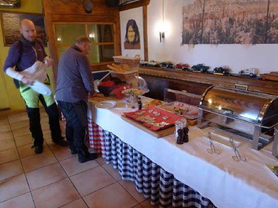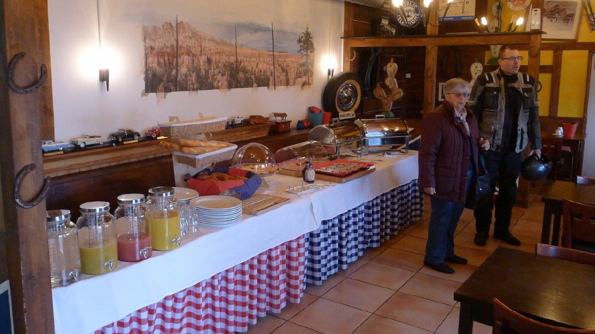Jeder wurde bestimmt satt, ich fand die Auswahl beim Brot, entweder Gipfeli oder Baguette, etwas mager. Wir sassen in einem eigenen Raum, was das Zusammengehörigkeitsgefühl unterstützte. Auch Vincent und Sara kamen zum Frühstück mit ihrer Tochter Céline - Vincent nahm die Gelegenheit wahr, um nochmals seine Honda GL1500 F6 «Valkery
