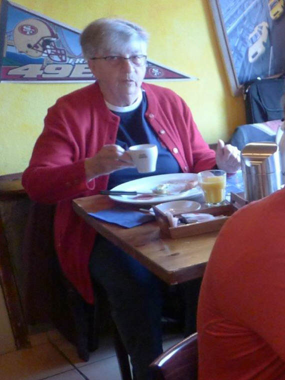 Schliesslich traf Milena mit Sigrid ein und sie nahmen bei Milly und mir am Tisch Platz. Für Sigrid ist es ein grosser Kraftaufwand, denn inzwischen entschwinden die Kräfte nach und nach auch in den Beinen! Beim Autofahren, wie auch in den öffentlichen Verkehrsmitteln trägt sie eine Hauskrause, um ihren Kopf zu stabilisieren, da ihr Kopf den Halsmuskeln grosse Schwierigkeiten bereitet. Es sind nun schon eineinhalb Jahre her, dass sie nur noch mit den Augen essen darf. Gerne streckt sie ihre Nase tief in eine Kaffeetasse, um wenigstens den Geruch aufzunehmen, was ihrem Gaumen verwehrt bleibt. |