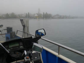 Da es in diesem Jahr kein Verschiebedatum gab (mehr dazu unten) mussten wir ganz einfach hoffen: Frühmorgens sah es noch ziemlich neblig aus, aber um 11 Uhr beim Start schien die Sonne und nur über dem Zürichsee hingen noch ein paar Nebelfetzen! Und überall, wo wir hinkamen, löste sich der Nebel gleich auf .... Meine Anfahrt ging diesmal über den Zürichsee, mit der Fähre Horgen-Meilen. |