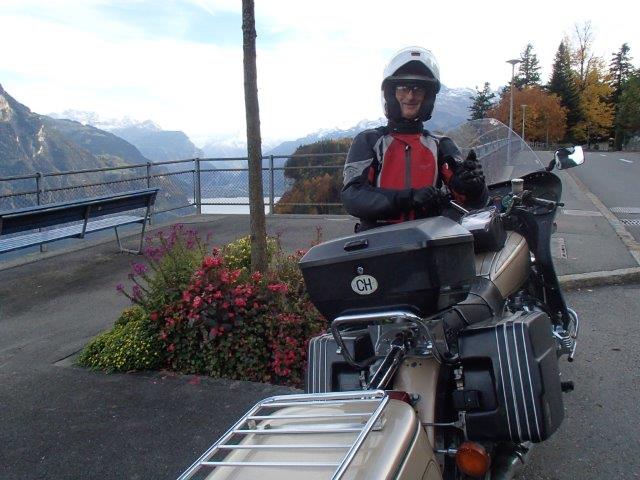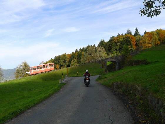 Die Aussicht in Seelisberg über das Urner Seebecken liessen wir uns nicht entgehen und machten noch ein paar Erinnerungsfotos. Diesmal wollte ich noch den Ächerlipass auf dem Nachhauseweg befahren. Der Einstieg in Dallenwil war gerade «besetzt»: x-Dutzend Pferde waren mit Soldaten unterwegs. Ich wusste gar nicht, dass es in der Armee noch Pferde hat … Dann begannen wir uns auf der kleinen Strasse den Berg hochzuwinden. Selbst mit einem Töff kann man mit Autos nicht überall kreuzen. Es war eine holprige Piste und Kuhdreck begleitete uns überall, auch war die Tageszeit mit der tiefstehenden Abendsonne auch nicht gerade die Beste für unser Vorhaben. Doch wir erreichten diesen kleinen Pass schon bald und eine Tafel mahnte uns daran, dass wir diese Strasse auf eigenes Risiko befahren würden. Als dann auf der andern Seite eine Tafel auf Rollsplitt warnte, war auch der letzte Reiz dieses Unterfangens gestorben. Sigrid liebte mich nicht für diesen Ausflug und ich hoffte, dass ihr Geburtstag nicht mit einem Sturz im Strassengraben enden würde. Doch wir schafften es, ohne mit dem Splitt allzu oft in Kontakt gekommen zu sein, auf der praktisch verkehrsfreien Strasse wieder im Tal auf guten Strassen zu landen. Nun hiess es nur noch, vor Einbruch der Dunkelheit nach Hause zu kehren. Bei Stans bogen wir auf die Autobahn ein und über die Autobahnen bis nach Thalwil ging die zügige Heimfahrt, trocken und gut über die Bühne. Es war ein herrlicher Tag, vom Aufstehen in der Bergwelt bis zur Rückkehr in die heimatlichen Gefilde. Und der Töff-Ausflug, da wir ihn heil überlebten, ein kleines Abenteuer in unserem Alltag – vielleicht der letzte in seiner Art für diese Töff- Saison.