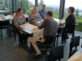 Die Woche vor dem 7. Oktober war spannend: Bereits am Montag hiess es im Meteo DRS, dass die Prognosen ungefähr so genau wären wie Kaffeesatz lesen! Die Szenarien reichten von Regen, Regen, Regen bis dass das Tiefdruckgebiet die Schweiz gar nicht streifen würde. Selbst am Mittwoch waren die Aussichten eher postitiv gefärbt fürs Wochenende, was sich dann am Donnerstag konkreter in «Niederschläge möglich, aber wenn überhaupt, dann nur unwesentliche Mengen»: Da ich mein «Jubiläums-Programm» wie geplant nur am ersten Sonntag durchführen konnte, weil der Gastgeber eine Woche später in den Ferien weilte, sah ich eher das Positive denn das Negative. So liess ich alle wissen, dass ich mich für die definitive Durchführung am 7. Oktober entschieden hätte. Dies änderte sich auch nicht, als in allen weiteren Prognosen die zu Beginn mit 0 Millimeter Niederschläge um 11 Uhr ständig nach oben korrigiert wurden. Das Frühstücksbuffet war bestellt und glücklicherweise meldeten sich in erster Linie welche ab für den Ausflug, welche sowieso sich erst für den Ausflug nach dem Frühstück gemeldet hatten … . |