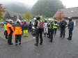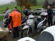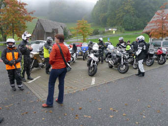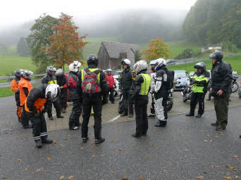 Da uns ab 11.30 Uhr der Apéro erwartete, war das Ziel, die Leute vor 10.45 Uhr in die Gruppen aufzuteilen und abfahrbereit zu haben. Da es inzwischen zu regnen begann, mussten sich alle entsprechend anziehen, was ebenfalls seine Zeit dauerte. Urs rief zum «Briefing» auf und gab letzte Anweisungen, wie man sich in der Gruppe zu verhalten hat. Da die meisten Teilnehmer aber sowieso bei den DO-Ausfahrten mitmachten, waren sie eigentlich schon informiert, wie sich das Ganze dann auf der Strecke abspielt.