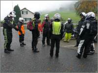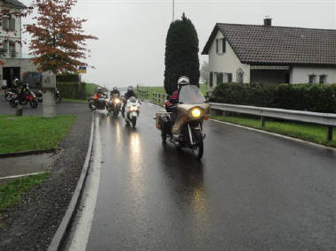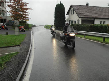 Die geplante Route konnten wir im ersten Teil (bis auf Oliver ...) einhalten: Die Fahrt dauerte, vor allem weil wir den «dreckigen Anteil» über den Katzenstrick wegen des Wetters ausliessen, knapp eine Fahrstunde. Es regnete nicht dauernd, und wenn, dann nur gering. Trotz der nassen Strassen kamen wir flott vorwärts, auch im Regen lässt sich gut Töff fahren, halt einfach mit weniger Schräglage, den Umständen entsprechend!