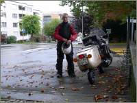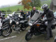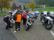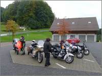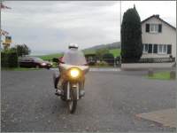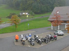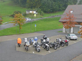 Wir waren nicht die Ersten, die da waren: Milly war auch bereits eingetroffen, zusammen mit ihrem Freund Edi im Auto, und sie machte schon fleissig Fotos zur Dokumentation meines 25.Jubiläums-Ausflugs. Toni Kägi mit Melanie, sowie David Held mit seiner Frau Karin auf der gemieteten Harley hatten uns geschlagen. Wir parkierten unsere Maschinen wie gewohnt gleich am Anfang des Parkplatzes: Kurz darauf traf Oliver mit seiner Frau Gaby ein, die Uhr zeigte 8 Uhr 55 und so früh war ich wohl noch nie eingetroffen. |