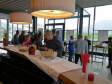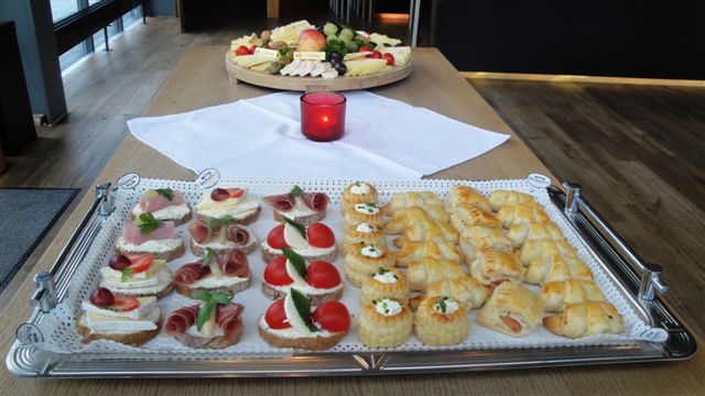 Nach und nach trafen auch die übrigen Gruppen ein und legten ihre nassen Kleider ab. Zum Apéro luden zwei der berühmten Käseplatten von Preisig, Richterswil ein sowie herrliche kleine Häppchen von der ortsansässigen Bäckerei Schefer, die mir von Franz empfohlen wurde. Umrahmt wurde das Ganze mit einer wunderbaren Früchteplatte, inmitten einer Galerie an halbgefüllten Gläsern mit Weisswein, Wasser und Orangenjus. Da die meisten mit einem vollen Bauch angefahren kamen, stürzten sich nicht alle gleich auf die Platten und so gaben sie auch länger noch etwas für die Augen her! |