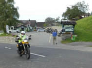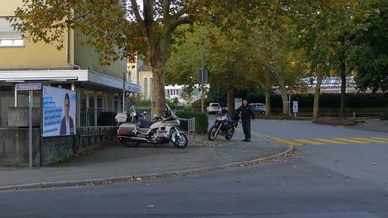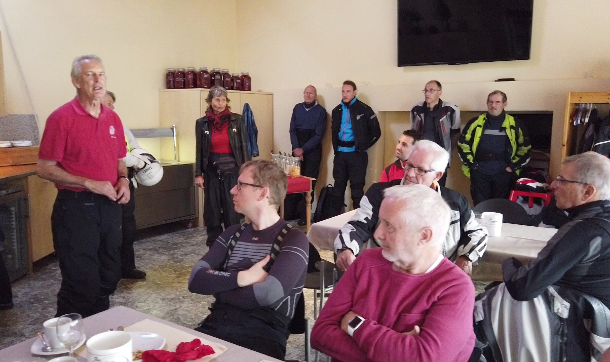 So gegen halb 11 Uhr besprach ich mich mit meinen Tourguides, die die Strecke schon vorher abgefahren hatte. Danach begrüsste ich offiziell alle Gäste, wovon Bernhard ein Filmchen machte. (Ausschnitt des nicht ganz scharfen Bildes) Dabei informierte ich über die Hruppenfahrregeln, die Tourguides mit ihren Gruppeneinteilungen und wie der ganze Tag ablaufen wird: «Fahrt ins Blaue», nur die Tourguides wissen, wo es langgeht. Da gab es ein Gelächter, denn Alain's Frau Sylvie hatte ihn begleitet, also wusste auch sie davon ... Ich gab 10 Minuten, um sich um 5 vor 11 Uhr zu besammeln und in den Gruppen aufzureihen. |