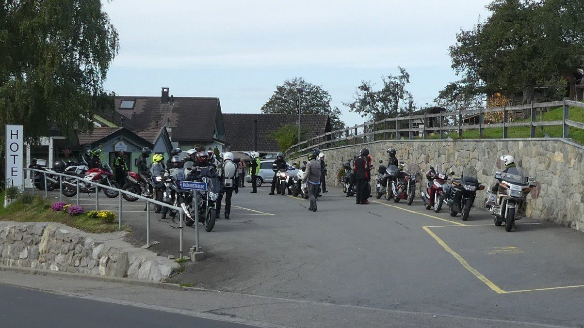 So gab es mit den 22 Maschinen drei Gruppen. Pünktlich um 11 Uhr startete die erste Gruppe, im 2 Minuten-Abstand folgten die übrigen. Erst ging es die kurvenreiche Strasse von Gommiswald hoch zum Rickenpass, danach hinunter nach Wattwil und Ebnat-Kappel: Dort begann unser Ausflug mit kleinen, unbekannten Strässchen, ohne Verkehr und immer wieder mit wunderbaren Aussichten in die Landschaft. Arthur landete auf dem Bendel (dort gibt es FREIHEIT einzuatmen!) und machte seinen Stundenhalt in der Höhe, wir übrigen trafen uns dazu am Bahnhof von Neu St. Johann-Nesslau. Da gab es die Möglichkeit, eine Toilette aufzusuchen.