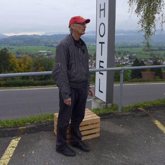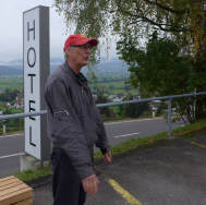 Es war Alain, einer der Tourguides, welcher mit mir auf direktem Weg in den Winzenberg oberhalb von Tuffertswil bei Lütisburg SG fuhr, wo uns das nächste Restaurant «Zur frohen Aussicht» erwartete. Ziemlich genau um 12 Uhr fuhren wir am Restaurant vorbei zum Aussichtspunkt, welcher über erst asphaltierte, dann betonierte Zufahrtsmeter bis zum nur knapp ansteigenden flachen Stück über die Wiese angefahren werden konnte. Wegen des erwarteten Regens galt es, so schnell wie möglich das Zelt aufzustellen. Für Alain war es das erste Mal, aber er war mir eine gute Hilfe. Um 12 Uhr stand das Zelt, der Tisch war bedeckt und das Zubehör lag bereit: Ich hatte neben zwei Thermosflaschen mit Heisswasser für Tee aus meinen riesigen Vorräten Trinkbecher, Kartonteller, Servietten usw. mitgenommen. Nun war Zeit, im Restaurant die Getränke, die Fleisch- und Käseplatten abzuholen. |