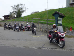 Nun hiess es für mich einpacken: Alain war mir eine grosse Hilfe und schon bald war alles im Auto. Wir lieferten alles wieder ab, eine ganze Fleischplatte blieb unangetastet, die Wirtin durfte aber, auch wenn mit Zellophan abgedeckt, nichts zurücknehmen. So übernahm Alain die Riesenportion, die kleineren Reste hatten wir schon untereinander aufgeteilt, für eine befreundete Familie. Auch Durst-mässig war nicht sehr viel gebraucht worden, allerdings waren meine beiden Thermoskannen leer. Heiss war offenbar mehr gefragt bei diesem Wetter. Nun fuhren wir, anfangs dieselbe Strecke wie die Teilnehmenden, und dann mehr oder weniger direkt zum Restaurant Leimensteig ob Haslen, welches an der Verbindungsstrasse Appenzell-Teufen liegt. Es waren vielleicht noch halb so viele Maschinen wie beim Apéro, aber es herrschte offenbar eine gute Stimmung im Haus: Denn als Corona-infizierter Gast richtete ich mich auf der Terrasse ein und ass das angebotene lokale Menu, Chäshörnli, Apfelmus und Appezöller Siedwürscht. Alain zeigte sich solidarisch, später gesellte sich Pat Ruepp zu uns. Ich begab mich mit dem Auto auf den Heimweg, Alain und Pat starteten erst zusammen, dann trennten sich ihre Wege: Pat über St. Gallen nach Henggart bei Winterthur, und Alain legte den Weg über den Rickenpass ins Zürcher Oberland. |