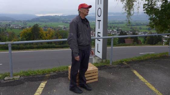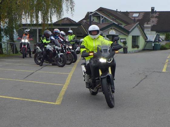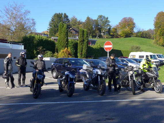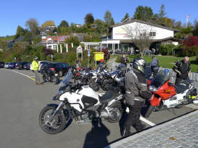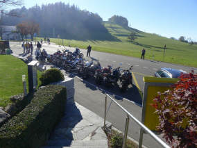 Nach und nach trafen immer mehr Leute ein und parkierten vor dem Haus: Doch der Besammlungspunkt war eigentlich auf dem allgemeinen Parkplatz auf der Nordseite der Passhöhe. Ich musste also alle „übere schüüche“ – in Anbetracht der vielen Englisch sprechenden Teilnehmer gar nicht so einfach! Inzwischen war es schon weit über 11.15 Uhr, die Teilnehmenden alle versammelt, doch einer fehlte immer noch: Einer der Tourguides! Roland ist immer sehr zuverlässig, ob ihn wohl seine Frau nach dem Frühstück nicht hat gehen lassen? ;-) Während ich wie auf Nadeln sass, für nur zwei Tourguides wären es fast zuviele Teilnehmende gewesen, rauschte eine Triumph in vollem Tempo an der Einfahrt zum Parkplatz vorbei. Gott sei Dank, er traf dann schliesslich doch noch am richtigen Ort ein! |