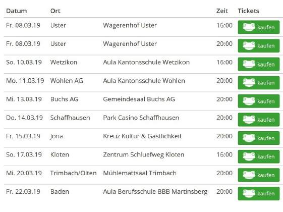 Vorstellung um 20 Uhr im «Thurgauerhof» in Weinfelden Adresse: Thomas Bornhauser Strasse 10, 8570 Weinfelden Türöffnung um 19 Uhr Eintritt: Fr. 30.-, Jugendliche U20 Fr. 20.-, Kinder U 10 Fr. 10.-