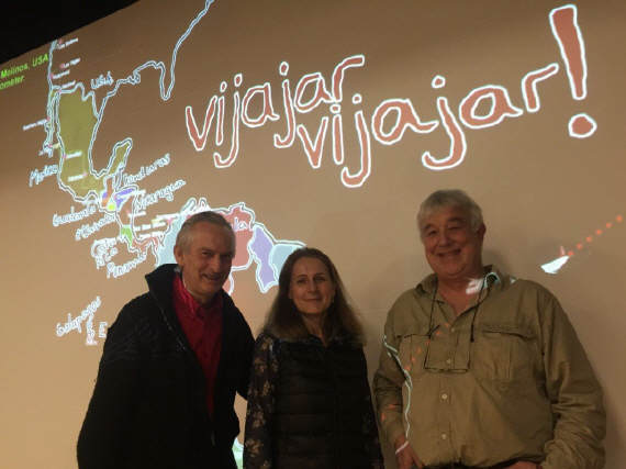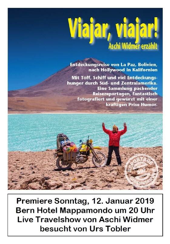 Am Samstag, 12.Januar besuchte ich die Premiere von Aschi Widmer‘s neuster Multimedia Liveshow „Viajar, Viajar“ - einem Reisebericht von seiner Reise durch Süd- und Mittelamerika und schliesslich dem Süden der Vereinigten Staaten mit seiner Suzuki DR650 über 17‘749 km in 4 Monaten. Das Motorrad dürfte etwa mit gegen 80 kg beladen gewesen sein, neben dem Reisegepäck die ganze Fotoausrüstung bestehend aus mehreren Kameras, dem Computerkoffer und beispielsweise 2 Drohnen. Das mitgeführte Benzin half einem Autofahrer aus der Patsche. |