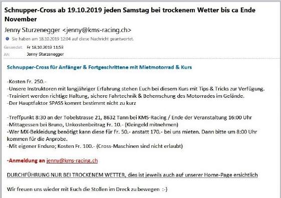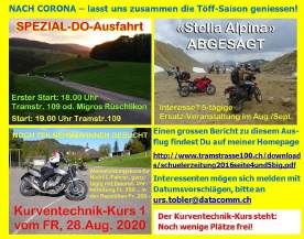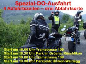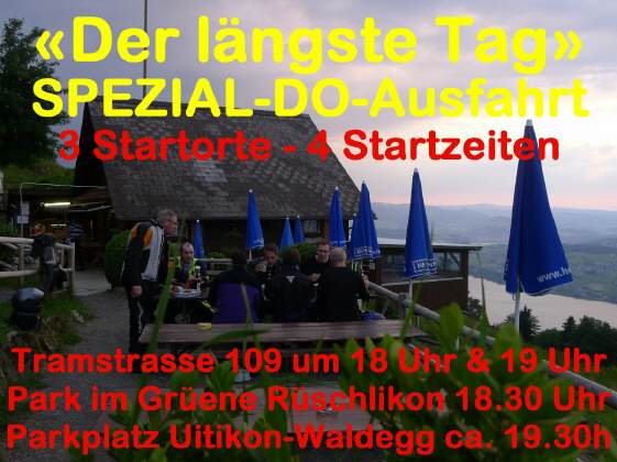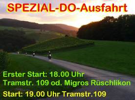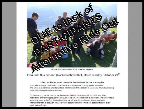 Mangels genügender Teilnehmer/innen ist die «SCHLUSSFAHRT» im geplanten Sinn ABGESAGT: Anstelle werden wir eine «DO-Ausfahrt PLUS» durchführen, die am Sonntag um 11.15 Uhr im Albispass startet.