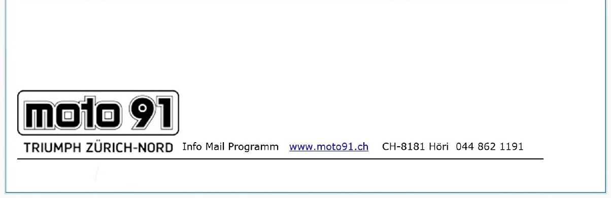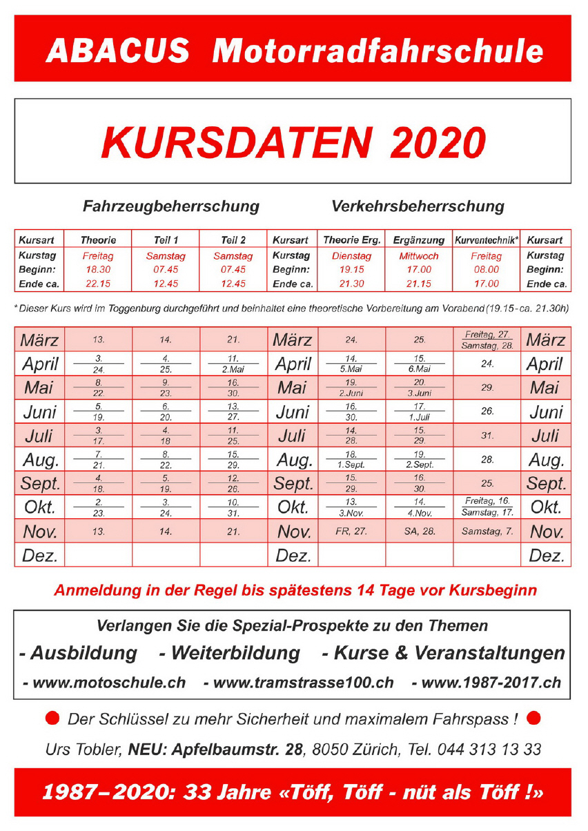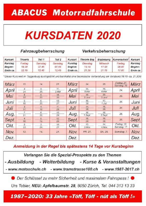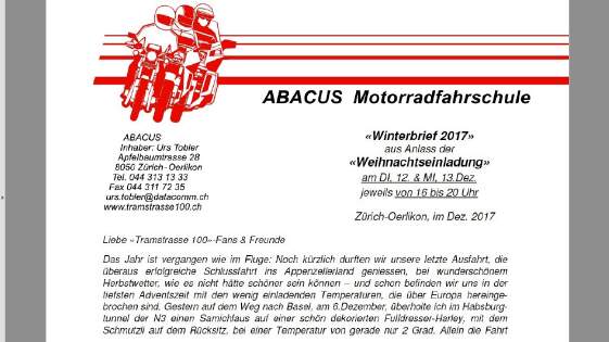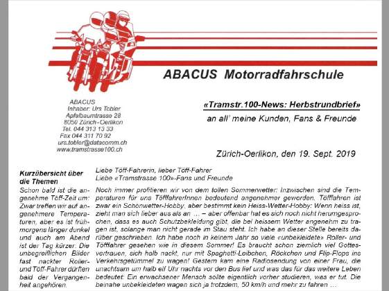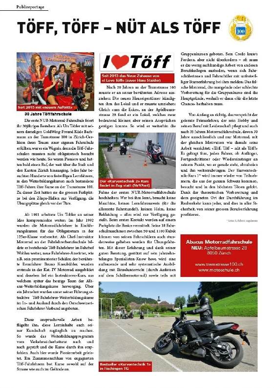 Die «Tramstrasse 100» ist nicht nur regional, sondern auch national eine bekannte Adresse: Doch seit einem Jahr nun findet man die ERSTE NUR-MOTORRADFAHRSCHULE an einem neuen Ort, etwa 200 Meter bergwärts an der Apfelbaumstrasse 28! 2017 ist ein Jubel-Jahr, deshalb werden wir mehr als sonst präsent sein! |