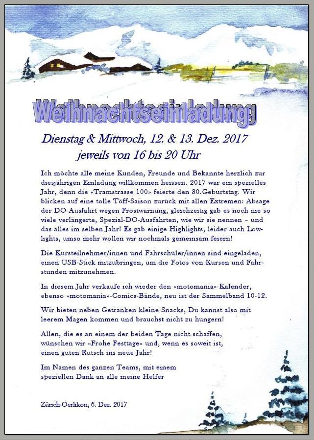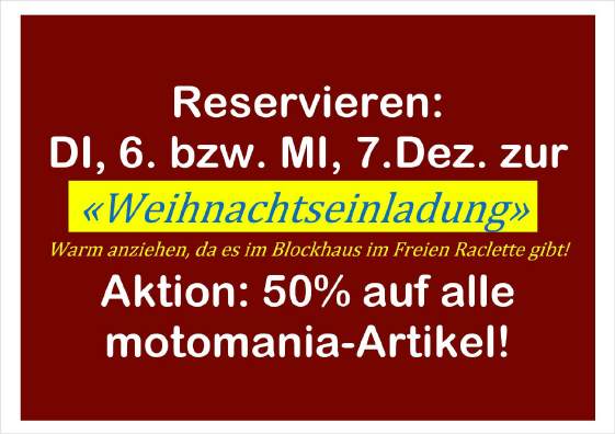 Wir werden an diesem Abend wiederum in der Holzhütte im Schülergarten vis-à-vis von meinem Geschäft Raclette anbieten, auch wird es einen Verkauf von Motomania-Artkel geben. Wer sich einen Motomania-Kalender auf sicher reservieren will, sende mir ein Mail. Man muss sich für den Abend nicht anmelden, aber für die Hütte warm anziehen. |