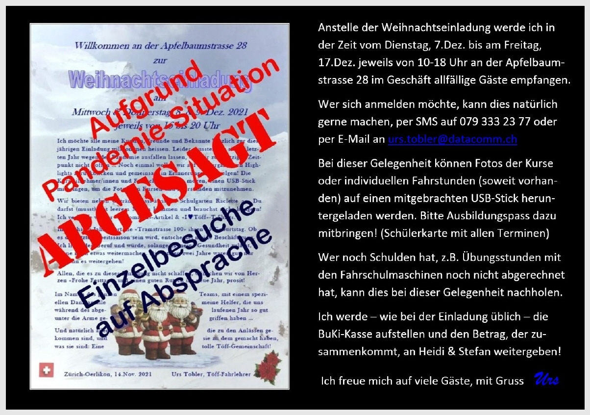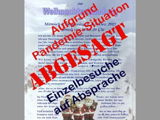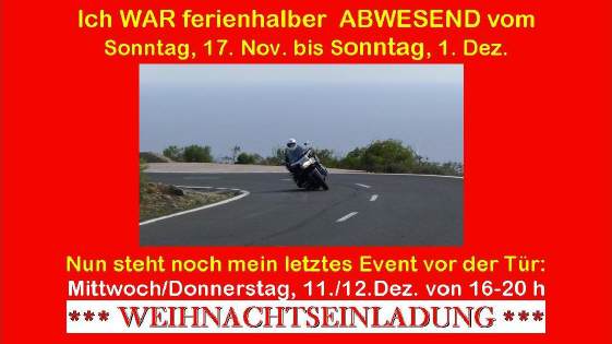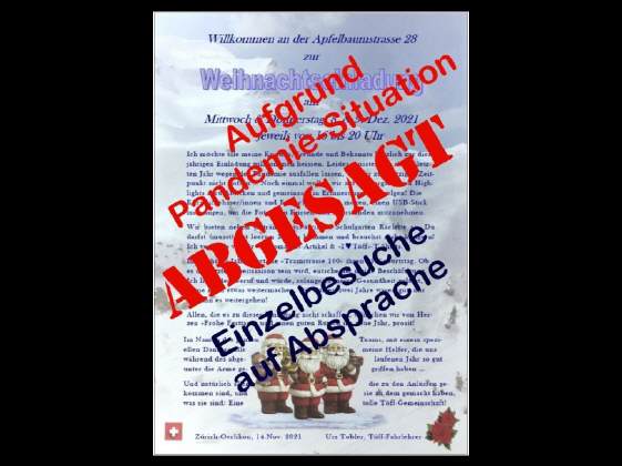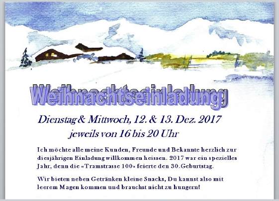 Die Weihnachtseinladung wird in diesem Jahr am Mittwoch, 12.Dez. und am Donnerstag, 13.Dez. jeweils von 16-20 Uhr stattfinden! Wir haben die Tage gewechselt, in der Hoffnung, dass die bisherigen 30 Besucher übertroffen werden. |