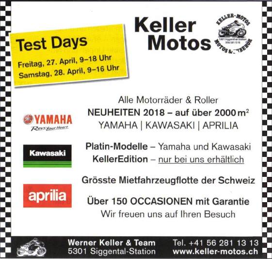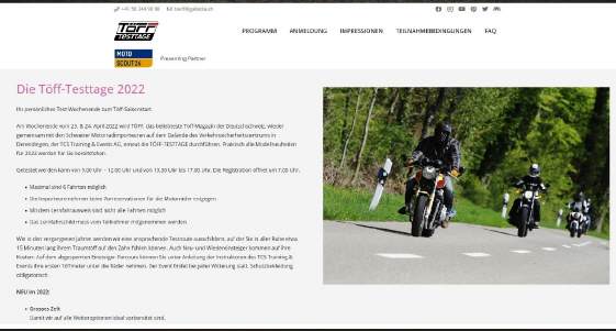 Die «Töff-Testtage» in Derendingen SO werden vom Team der CH-Motorradzeitungen «MotoSportSchweiz»/«TÖFF» durchgeführt in Zusammenarbeit mit TCS Training & Events, dafür gibt es eine Extra-Webseite: «Klick»e auf das Bild unten