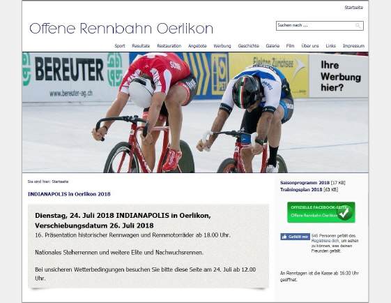 Die «Offene Rennbahn Oerlikon» führt seit 2002 regelmässig ein Mal im Jahr das «Indianapolis» durch, eine Veranstaltung mit historischen 2-, 3- und vier-rädrigen Rennfahrzeugen, die dem staunenden Publikum präsentiert werden. Das Besondere dabei ist, dass man im Innenraum sich frei bewegen darf und mit Fahrzeugen wie auch Besitzern auf Tuchfühlung gehen kann. Ob die Veranstaltung definitiv stattfindet (sie wurde bereits verschoben vom DI auf DO), kannst Du mit diesem Link rausfinden. Eintritt ab 16 Jahren: Fr. 20.-, Programm ab 16 Uhr Am 1.August findet ein besonderer Anlass statt: Bei freiem Eintritt kann man die Rennbahn besuchen, es werden Führungen geboten und man kann die Geschichte dieses «Kulturgutes» kennenlernen. Link [5'831 KB]