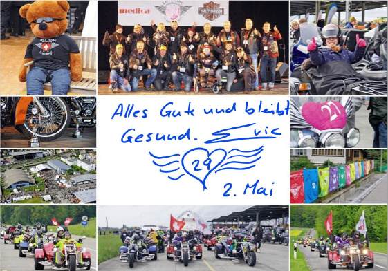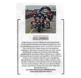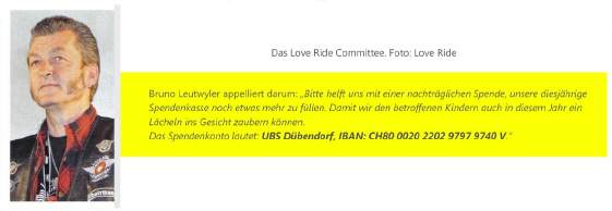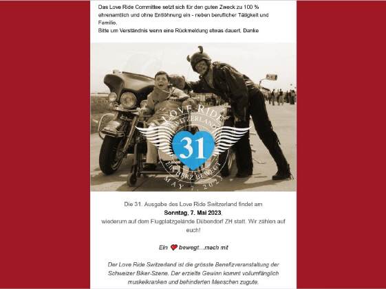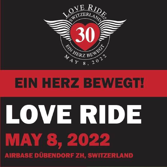 Der LOVE RIDE wird zwar von der Harley-Szene als grösste Biker-Party mit karikativen Hintergrund veranstaltet, ist aber offen für alle Roller und Motorräder, selbst mit Fahrrädern, öV oder zu Fuss reisen viele Schaulustige an und geniessen die friedliche Atmosphäre, die auf dem Festgelände herrscht und helfen mit ihrem Eintritt, das Resultat aufzubessern, geht doch der ganze Gewinn in Projekte, vorwiegend für muskelkranke Mitmenschen. RIDE OUT: An der Ausfahrt dürfen die ersten 5'000 Fahrzeuge teilnehmen, mit Polizeibegleitung sind total 10 Gruppen zu je 500 Fahrern unterwegs. In der ersten Gruppe können dank der Hilfe vieler Seitenwagenfahrer, Trikes, Ecomobilen, Monotracern und anderen mehrspurigen Spezialfahrzeugen nahezu 300 behinderte Personen als Passagiere mitfahren. Das ist bestimmt für viele dieser in unserer Gesellschaft am Rande lebenden, von ihrem Leiden belasteten Mitmenschen der Höhepunkt des Jahres. Einerseits die Freude, die diese erleben dürfen, andererseits das Geld, das in vielen Fällen helfen kann und die Tatsache, dass dieser Anlass weit über die Töff-Szene hinaus Beachtung findet, regelmässig mit einer Fernsehreportage in den Tagesnews von Fernsehen srf, machen den LOVERIDE für alle daran Beteiligten zu einer sehr wertvollen Veranstaltung. |