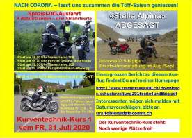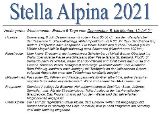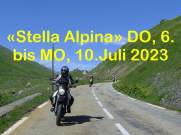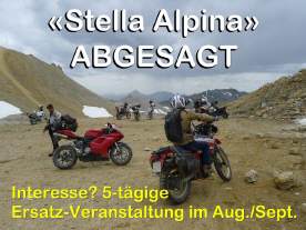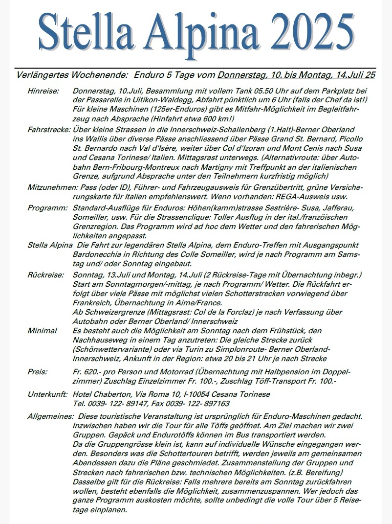 Stella Alpina/ Gelände Dieses speziell für Enduro-Fahrer ausgeschriebene verlängerte 5-tägige Weekend findet jeweils am 2.Juli-Wochenende statt. Die 600 km lange Anfahrt auf Teerstrassen ist landschaftlich wie fahrerisch eine Herausforderung. Dann fahren wir 3 Tage vorwiegend über Kies- und Schotterstrassen, z.T. auf Wanderwegen teilweise bis auf 3000 Meter Meereshöhe. Hinfahrt vorwiegend über Schweiz-Italien, Rückfahrt vorwiegend über Frankreich-Schweiz.