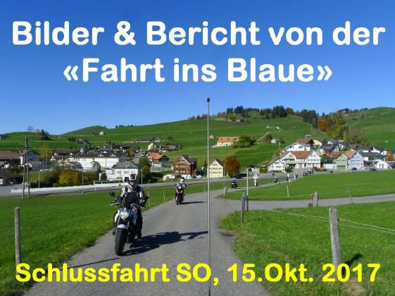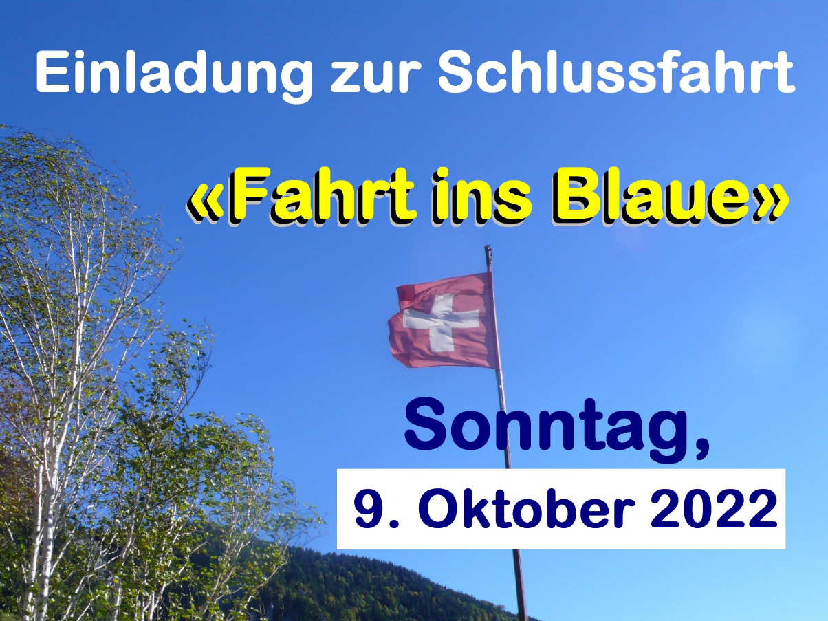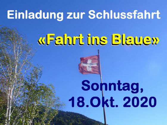 Unter dem Motto: «FAHRT INS BLAUE» führt uns die Schlussfahrt an einen unbekannten Ort in der Zentralschweiz - diesmal auf nicht ganz unbekannten Wegen, doch die Überraschung ist garantiert, sowohl was den Apéro-Platz wie auch das Ziel betrifft - als Abschluss einer erfolgreichen und unvergesslichen DO-Ausfahrtssaison.