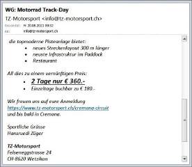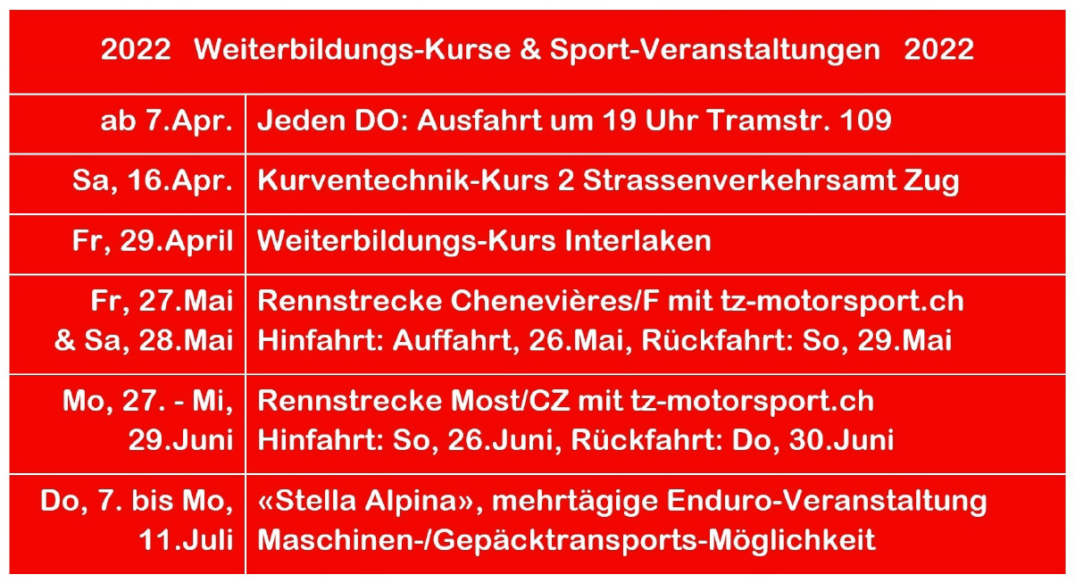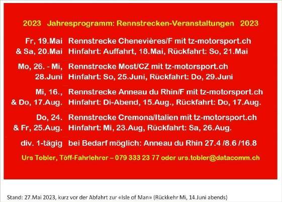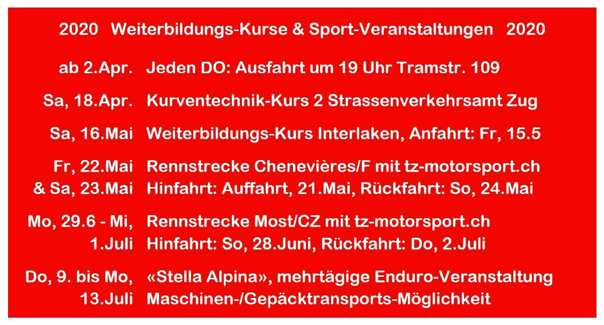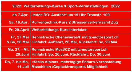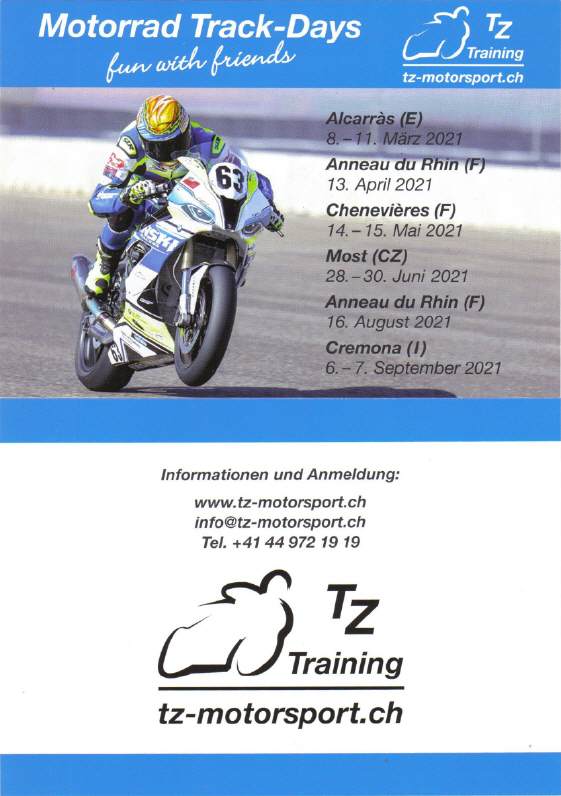 Rennstreckenveranstaltungen haben in der «Tramstrasse 100» eine lange Tradition! 1987 fuhr ich erstmals, frisch vermählt, mit meiner damaligen Frau Luzia zu einem «Fahrlehrer-Lehrgang» des SMFV in Zusammenarbeit mit dem ifz (Institut für Zweiradsicherheit e.V.) an die «Nürburgring-Nordschleife». Da nahm es uns «den Ärmel ine»: Ab 1988 fuhr ich mehrmals jährlich, erst als Teilnehmer, später als Instruktor von «Moto aktiv e.V.» zur Nordschleife. Ich brachte ganze Gruppen aus der Schweiz zum Training, aber immer in Untermiete bei einem Veranstalter. Später, in der Zeit der Frauenrennen, die durch Sue Stammbach beim MSS initiert wurden, besuchte ich mit Luzia die Rennfahrerschule von Moto aktiv in Val de Vienne, wobei wir erstmals unsere CBR600F dafür einsetzten. Diese, inzwischen 25jährige Maschine, ist mir auch heute noch ein treuer Begleiter: Mehr braucht es nicht um Spass zu haben. Mein Partner inzwischen ist mein Berufskollege, Hansruedi Züger aus Wetzikon, der unter «tz-motorsport.ch» regelmässig Rennstreckenveranstaltungen anbietet. Wer mit mir kommt, kann von meiner Infrastruktur (Toyota HiAce-Bus als Personen- und Gepäck-Transportfahrzeug) und meiner Erfahrung auf der Rennstrecke profitieren. In einem Anhänger führen wir die Rennmaschinen mit. Die Anfahrt ist je nach Strecke und Weg auf Achse mit der eigenen bequemen Tourenmaschine oder im Auto, aus Zeit- oder Distanz-Gründen.