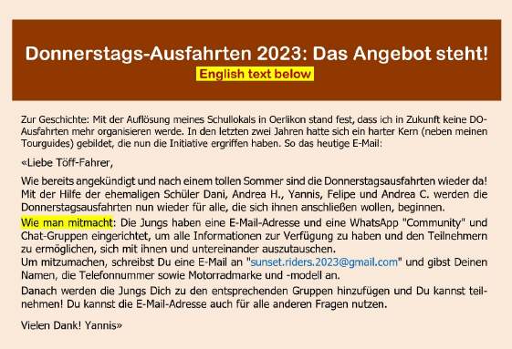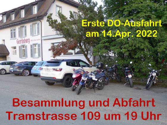 1982 eröffneten wir in der «Verkehrsschule Baumann» in Zürich-Schwamendingen die erste Töff-Fahrschule auf dem Platz Zürich, die regelmässig alle Samstage Gruppen-Kurse anbot. Wir, das waren Marcel Baumann und ich, die im Fahrhof Wohlen gerade das Seminar für Töfffahrlehrer besucht hatten. Zu dieser Zeit gab es im Kanton Zürich einzig noch eine Gruppe von 4 Fahrlehrern, die damals auf der Piste des Strassenverkehrsamtes im Kreisel Hinwil, ebenfalls regelmässig Kurse anboten. Es blieb nicht nur bei den Kursen und Fahrstunden, wir organisierten Ausfahrten (zum Teil gar ins Ausland) und wir hatten einen Stamm, der jeweils am Donnerstagabend im Restaurant Alpenrösli in Wallikon ob Pfäffikon ZH stattfand. Als Küde und ich an der Tramstrasse unsere eigene Töff-Fahrschule begannen, richteten wir eigentlich von Anfang an unsere DO-Ausfahrten ein, die aber immer an andere Zielorte gingen: So erinnere ich mich beispielsweise gut an die «Schloss-Burg» in Häuslenen/TG, aber auch die Sattelegg beispielsweise, oder die Chommle oder die Burg Hohenklingen in Stein am Rhein - allesamt Destinationen, die wir auch noch heute regelmässig anlaufen. Seit ich im März 2016 an der Tramstrasse 100 ausziehen musste, verlegten wir den Sammelpunkt an die Tramstrasse 109, wo wir bei der Firma «home service» Gastrecht geniessen. Die DO-Ausfahrts-Saison geht von April bis September, an Auffahrt findet keine Ausfahrt statt, ebenfalls wenn der 1.Mai oder 1.Aug. auf einen Donnerstag fällt.