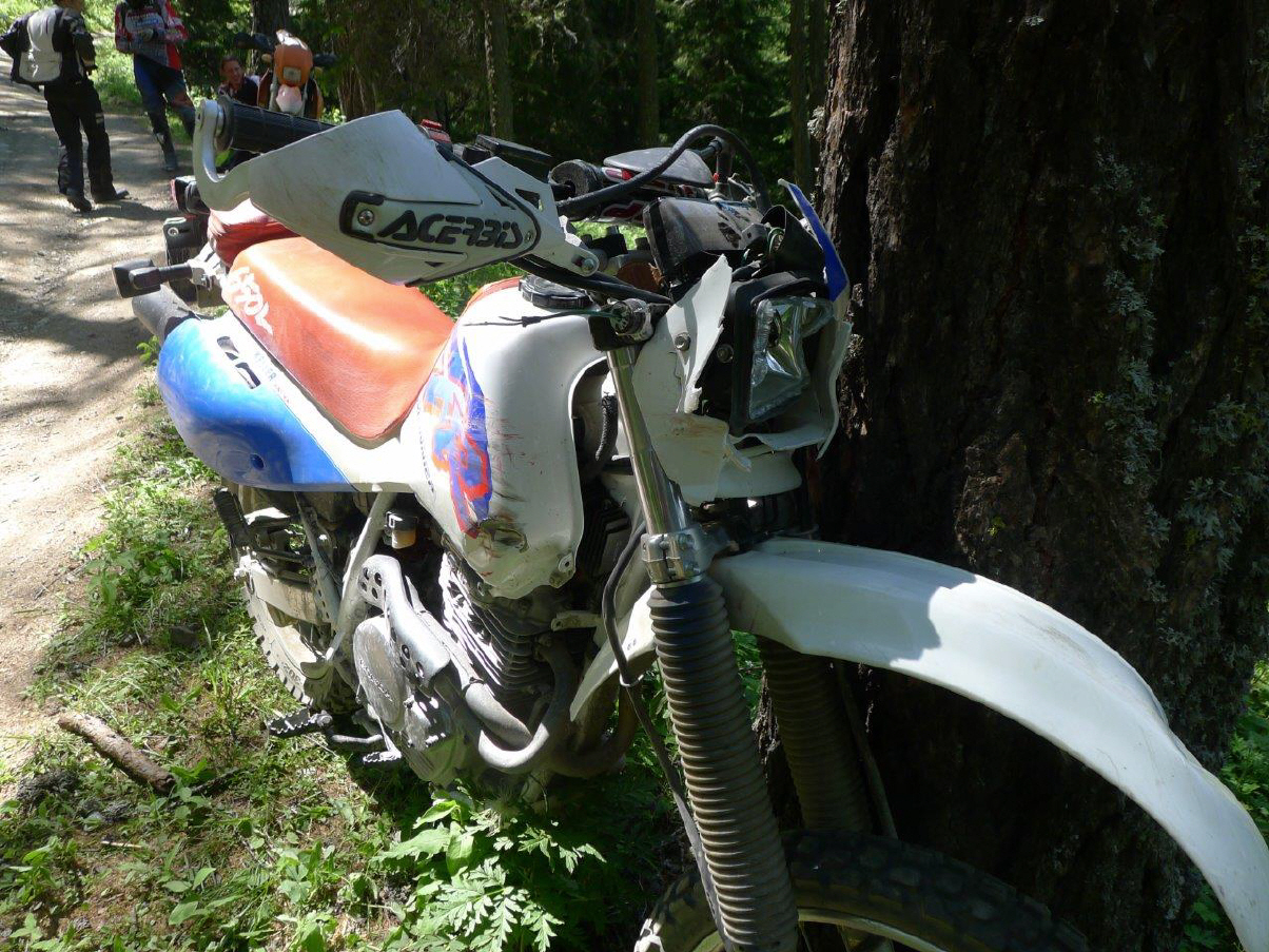 Nach dem Mittag kam mir auf einem engen Waldweg ein Italiener frontal entgegen, der Crash eine halbe Sekunde nach der ersten Wahrnehnung unvermeidlich: Glück im Unglück, da beide unverletzt blieben und wir beide mit den Maschinen weiterfahren konnten. Abgesehen von einem Unfall vor zwei Jahren, dem einzigen meiner Fahrlehrer-Karriere mit Ambulanz anlässlich einer Fahrstunde, hatte ich nie eine solch gefährliche Begegnung auf dem Töff seit ich neunzehn war, wo ich gegen ein Auto schlitterte und zum Glück abprallte.