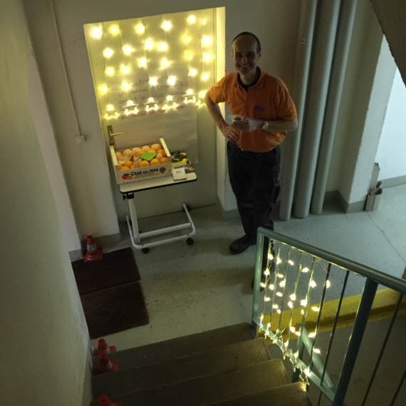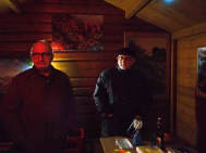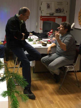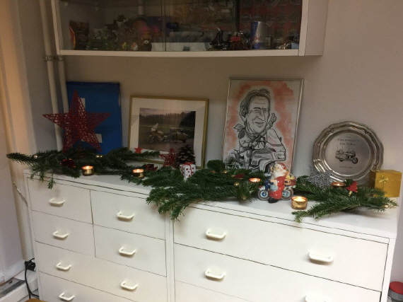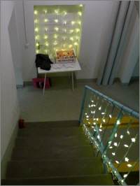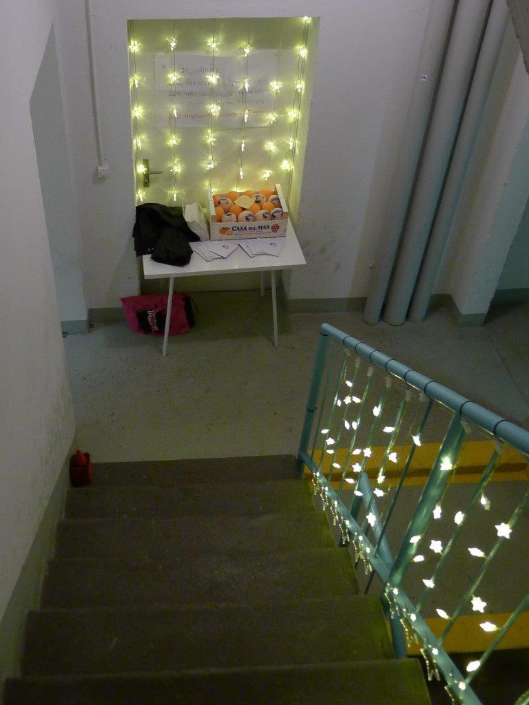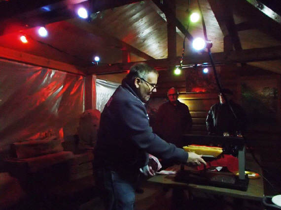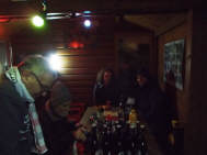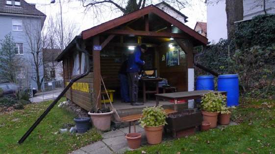 Bereits am Dienstag half mir Gregor nach Arbeitsende: Die Sterne mussten in die Fenster gehängt werden, der beleuchtete Weihnachtsmann auf dem Töff natürlich auch! Dann kam der Eingang (die Gäste kommen über den Hauseingang des Blockes herein, damit der Platz im Lokal besser genützt werden kann) dran, wie in den Vorjahren empfing eine warme Weihnachtsbeleuchtung die ankommenden Gäste. Das Blockhaus übernahm ich erst am Mittwochmittag: Urs hatte sich um halb 3 Uhr angemeldet, Gregor traf etwas später ein und half ihm alles vorzubereiten.