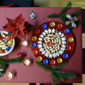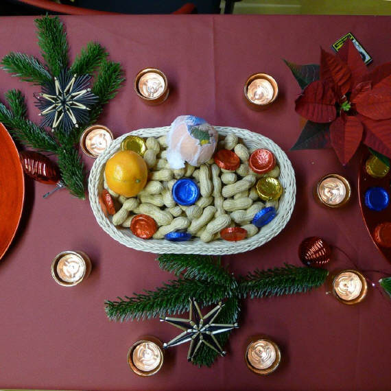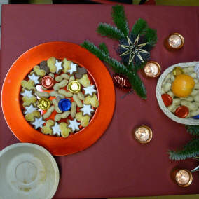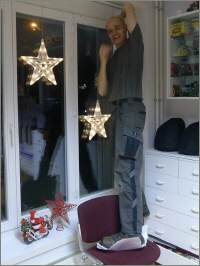 Die diesjährige Vorbereitung der Weihnachtseinladung war weniger gestresst als auch schon. Da Karin und ich bereits am 1.Dez. von unseren Ferien auf Teneriffa zurückkamen, konnte ich noch rund 120 persönliche Einladungen versenden. Ab Montag brachte ich das Lokal auf Vordermann, so dass die Helferinnen am Mittwoch kaum mehr putzen, nur noch dekorieren mussten. Gregor war mir einmal mehr ein grosser (im wahrsten Sinn des Wortes: 1 Meter 94) Helfer, mit ihm zusammen richtete ich am Dienstagnachmittag die Beleuchtungen ein. Den Schlüssel zum Blockhaus bekam ich erst am Mittwochmittag, doch Urs und Gregor blieb genügend Zeit, um für die ersten Gäste bereit zu sein. |