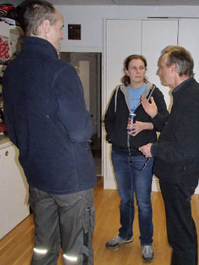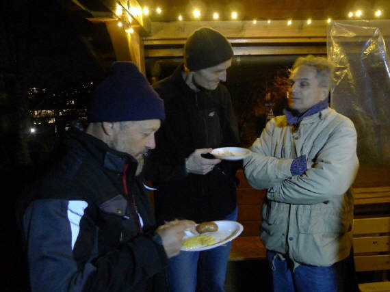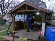 Am zweiten Abend dauerten die Vorbereitungen nicht mehr so lange. Etwas weniges dazu einkaufen, dann alle Abfälle wegräumen und wieder alles in Häuschen tragen. Karin kochte wieder die Erdäpfel, Urs stieg wieder in die Hosen, auch am zweiten Abend alle hungrigen Mäuler zu stopfen. Da es an diesem Abend viel mehr Gäste gab, ein ganz hungriger aus dem St. Gallischen (!), wurde er richtig herausgefordert. Elvira hatte sich offenbar am Abend vorher erkältet und auch Renato war froh, dass es an diesem Abend ohne ihn ging. "Liebe ist, wenn beide husten!" Der Abend verging wie im Flug und kurz vor dem Zusammenräumen, traf auch noch Sebastiano ein: Für ihn und auch ein paar andere hiess es dann zusammenräumen. Vielen Dank, dank vieler zupackender Hände waren wir vor 21 Uhr fertig mit der ganzen Aktion.