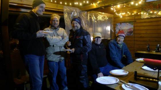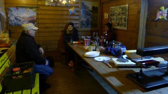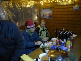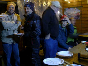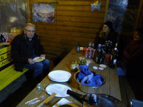 Gregor und Urs waren in der Zwischenzeit soweit, die hungrige Mannschaft zu versorgen: Milly und ich zogen es aber vor, im Lokal an der Wärme zu essen. Nach und nach kamen weitere Gäste dazu. Die beiden Damen zeigten Härte, zogen sich warm an und leisteten während ihrem Nachtessen im kalten Blockhaus Urs Gesellschaft. Er war am ersten Abend eigentlich unterbeschäftigt, schade.