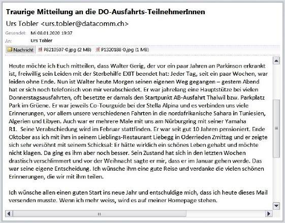 Die Verabschiedung findet am 15.Febr. 2020 um 14.00 Uhr im «Serata» in Thalwil statt. Wir haben beschlossen, zum Anlass mit dem Töff hinzufahren. Der unbestätigte Treff-Punkt ist auf dem Albispass. Gemeinsame Wegfahrt nach Thalwil kurz nach halb 2 Uhr. Genaues sende ein SMS mit dem Text DOAUSFAHRT an die Nummer 8400 (an Freitagabend sollte alles festgelegt sein und die Info aktualisiert)