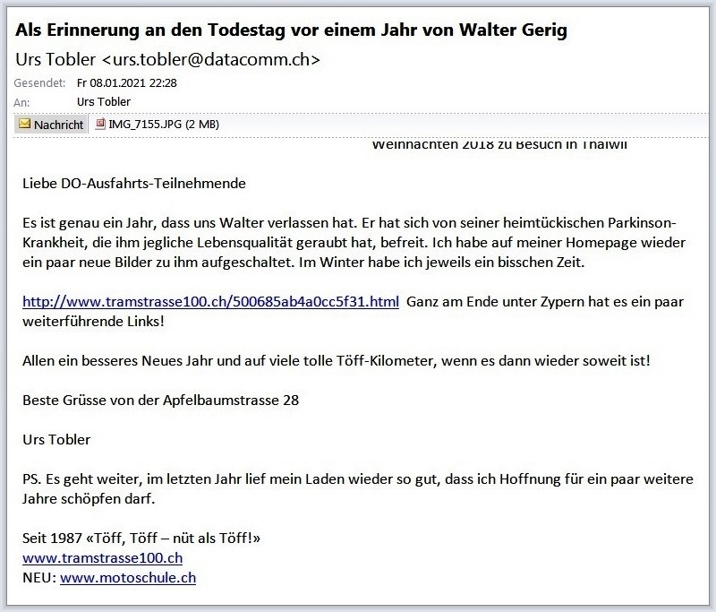 Ja, es ist nun schon ein Jahr um - er hat sogar noch mit seiner Verabschiedung Rücksicht auf uns Töfffahrer genommen: Bei unserem letzten Telefongespräch am Abend davor fragte er mich, wann die SWISS-MOTO stattfindet, dann war es am Samstag vor der SWISS-MOTO 2020, an welcher wir ihn in Thalwil verabschiedeten. Für mehr Bilder «klick»e auf das Bild unten!