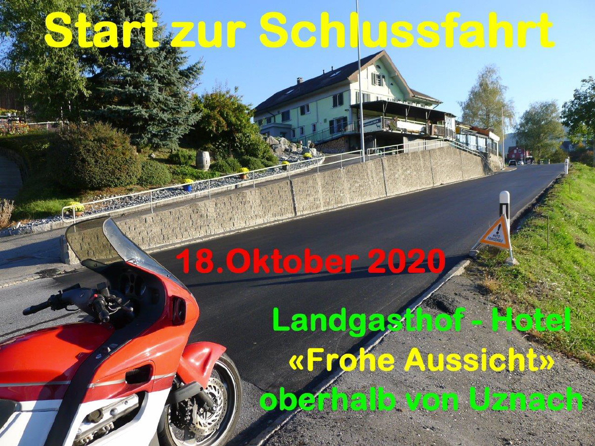 NEUER TREFFPUNKT: Da die Luegeten in Konkurs gegangen ist (nicht kommerziell, sondern wegen Knatsch der Besitzer), musste ich für Ersatz sorgen und bin fündig geworden im Landgasthof Frohe Aussicht oberhalb von Uznach, an der Strasse in Richtung Gommiswald. Wir treffen uns also dort zum Frühstücksbuffet und zum Start zur Ausfahrt. |