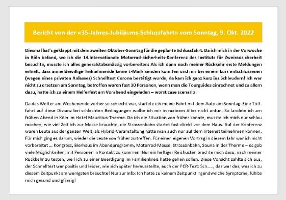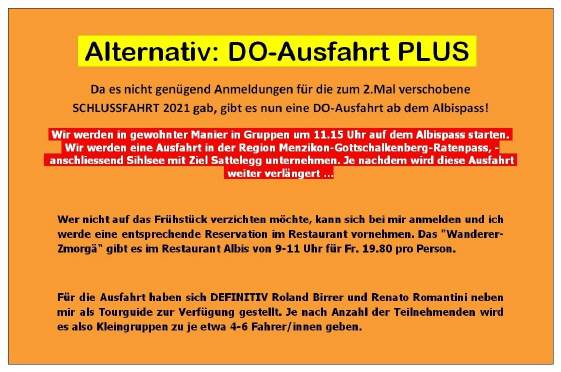 Die SCHLUSSFAHRT 2022 findet definitiv am Sonntag, 9.Okt. 2022 statt! Mehr Informationen bekommst Du hier , Link zur Teilnehmerliste