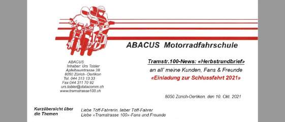 Seit 2004 führen wir regelmässig im Oktober die «Schlussfahrt» durch, zu einer «Fahrt ins Blaue» mit unbekanntem Ziel. Bei der ersten Durchführung landeten wir im Triesenberg/FL. Anlässlich dieser Ausfahrten besuchten wir beispielsweise die «Ällgi-Alp» (2006), wo sich die geografische Mitte der Schweiz befindet und alle «Schweizer des Jahres» verewigt sind, wir fuhren bis ans «Ende der Welt» (2005), dem gleichnamigen Restaurant in Engelberg, aber wir fuhren auch namhafte und historische Orte an wie die Rütliwiese oder die Suworow-Brücke (2007), die Schlacht-Kapelle bei Sempach (2012). Weitere Fahrten gab es mehrmals in Richtung Glarnerland oder in Richtung Toggenburg, Appenzellerland, wie im Jahr 2017 bei der speziellen Schlussfahrt aus Anlass des 30jährigen Jubiläums meiner Töfffahrschule ins Rest. «Ziel» ob Altstätten/SG.