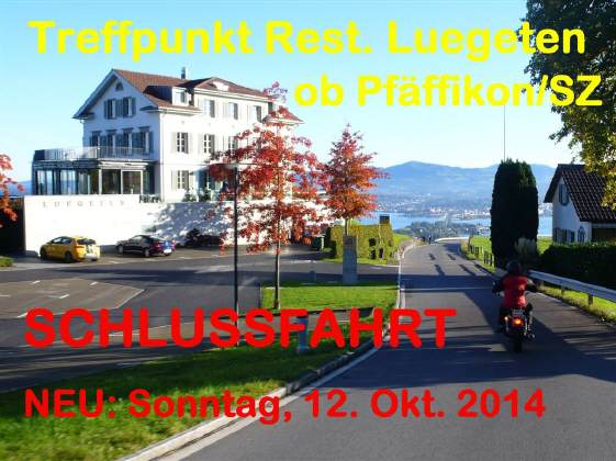 Nachdem wir anlässlich der letztjährigen Schlussfahrten in der Luegeten jeweils einen warmen Empfang bekommen hatten, mit einem wirklich schönen Frühstücksbuffet (klicke aufs Bild rechts, dort siehst Du mehr) starten wir auch in diesem Jahr an diesem wunderschönen Ort. Die Schlussfahrt findet nun definitiv am Sonntag, 3. Oktober 2010 statt. Die «Luegete» befindet sich oberhalb von Pfäffikon/SZ an der Etzelstrasse, ab der Seestrasse in Richtung Etzel/Feusisberg oder von Schindelegi her über Feusisberg anzufahren. |