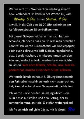 Während dem Essen gab ich bekannt, dass hier alle meine geladenen Gäste wären und ich das Glas aufstellen würde für «BuKi»-Spenden: Es kamen an diesem Tag Fr. 1'354.- plus 20 Euro zusammen. Per Mail wurden weitere 200 Franken angekündigt, noch einmal 100 Franken lagen bereits vor von einem verhinderten Teilnehmer. Somit kamen insgesamt etwa 1500 Euro zusammen, die an die «BuKi - Hilfe für Kinder in Osteuropa e.V.» gehen. Ganz im Sinne meiner verstorbenen Lebenspartnerin Siggi, die am kommenden Samstag ihren 51.Geburtstag gefeiert hätte. |