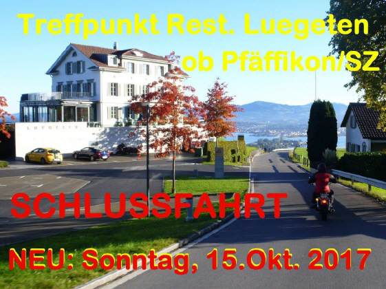 Die Ausfahrt fand am SO, 15.Okt. 2017 statt, bei schönstem Wetter: Die Verschiebung hatte sich absolut gelohnt. Alle die dabei waren, hatten einen super-tollen Töff-Tag, mit einer spannenden Ausfahrt, einem sensationellen Apéro-Platz und einen ebenbürtigen Abschluss im Ziel bei einem feinen Essen. Alle die zu diesem Erfolg beigetragen gebührt ein herzlicher Dank! «Klicke» auf obiges Bild und Du landest beim Bericht und den Bildern!
